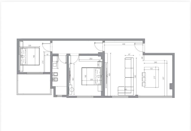 It has a total surface of 103 m2 and an internal surface of 96 m2, organized into a living room together with the kitchen, 2 bedrooms, a bathroom, and a balcony.